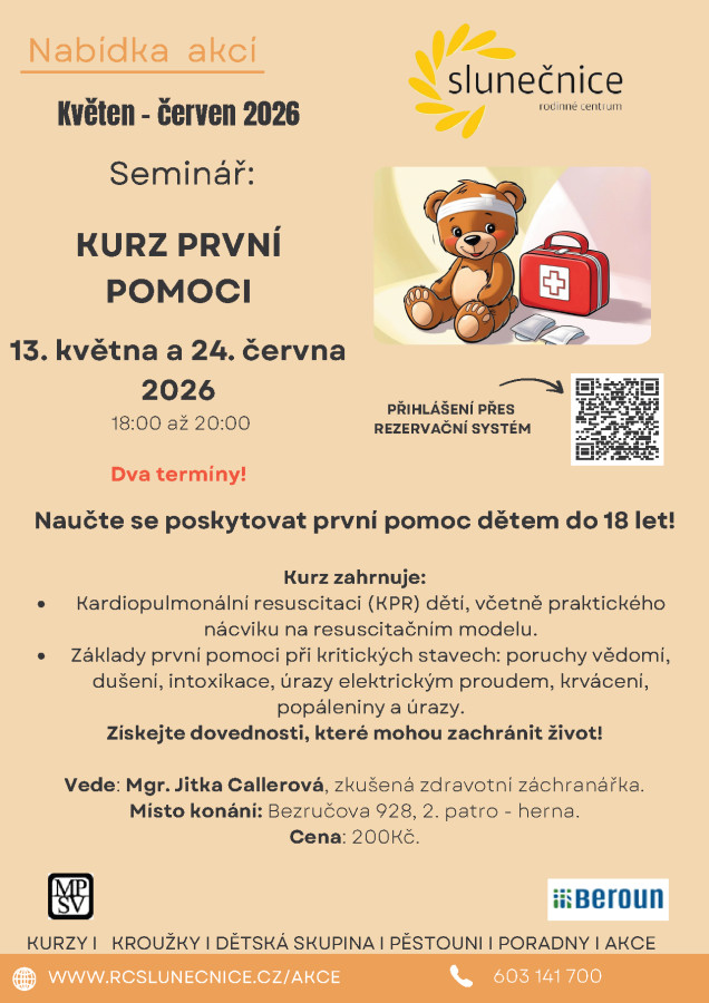 Více informací: www.rcslunecnice.cz/kurz/kurz-prvni-pomoci-zamereny-na-deti-0-az-18-let-2/