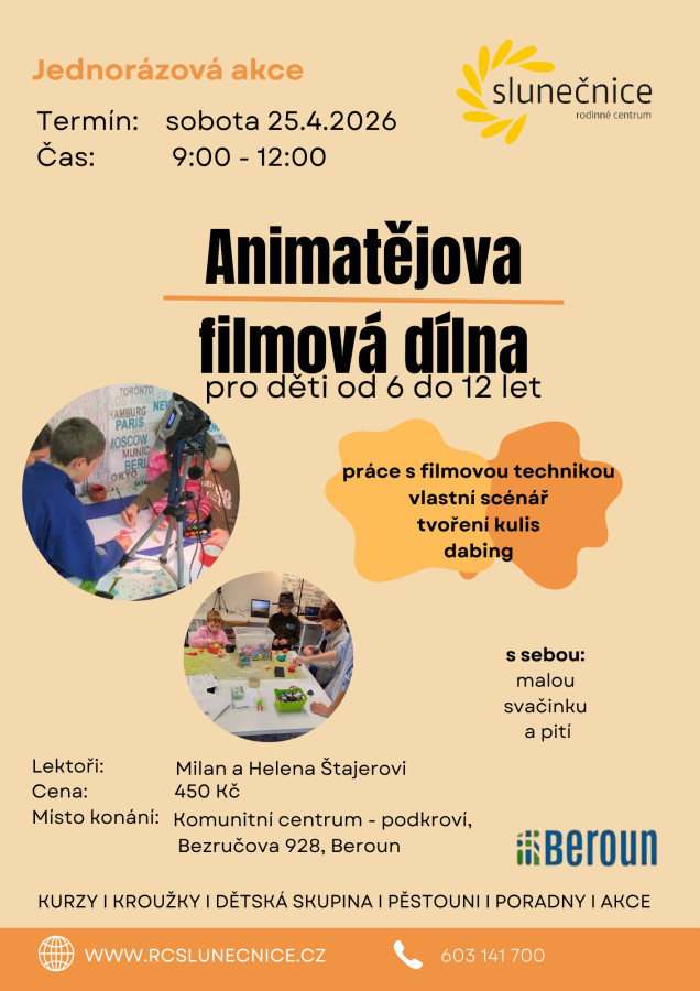 Tvůrčí kroužek provede děti všemi fázemi tvorby animovaného filmu. Vymyslíme scénář, vytvoříme rekvizity a kulisy, vyzkoušíme si dabing a práci s filmovou technikou. Průvodcem jim kromě lektora bude panáček Animatěj, filmovou tvorbu mají oba v malíku. Kroužek rozvíjí kreativitu, smysl pro detail, rukodělné dovednosti i schopnost spolupracovat v různorodém kolektivu a trpělivost.